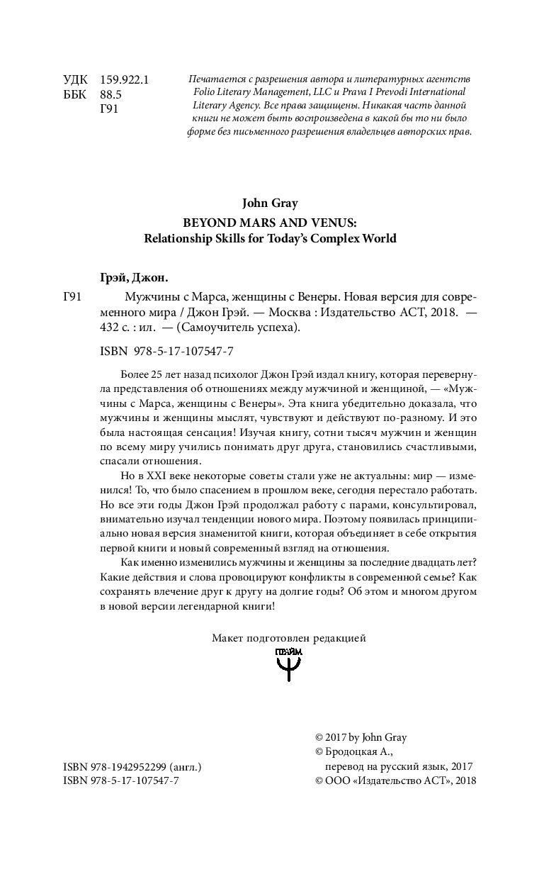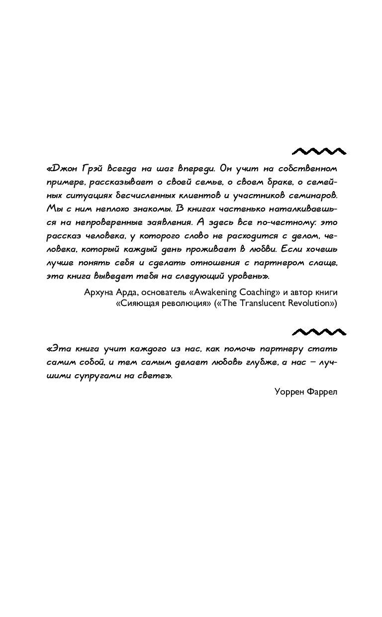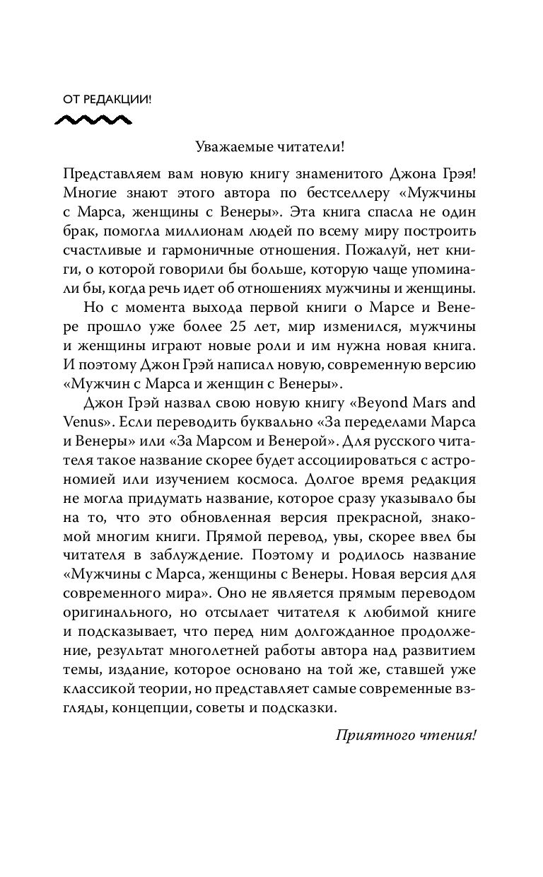 Более 25 лет назад психолог Джон Грэй издал книгу, которая перевернула представления об отношениях между мужчиной и женщиной, - "Мужчины с Марса, женщины с Венеры". Эта книга убедительно доказала, что мужчины и женщины мыслят, чувствуют и действуют по-разному. И это была настоящая сенсация! Изучая книгу, сотни тысяч мужчин и женщин по всему миру учились понимать друг друга, становились счастливыми, спасали отношения.Но в XXI веке некоторые советы стали уже не актуальны: мир - изменился! То, что было спасением в прошлом веке, сегодня перестало работать. Но все эти годы Джон Грэй продолжал работу с парами, консультировал, внимательно изучал тенденции нового мира. Поэтому появилась принципиально новая версия знаменитой книги, которая объединяет в себе открытия первой книги и новый современный взгляд на отношения.