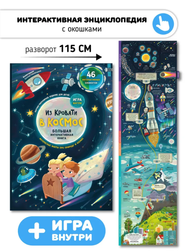Открой увлекательную развивающую книгу для детей с окошками и настольной игрой "Из кровати в космос" и ты сможешь прокатиться на канатной дороге, полетать на самолете, и даже умчаться на ракете в открытый космос!Характеристики