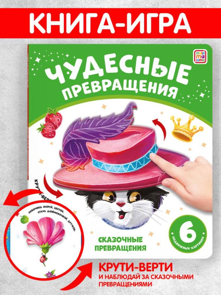 Перед вами книга-игра! Внутри нее не простые картинки, а их чудесные превращения! Стоит только покрутить подвижную деталь, как цветок превратится в Дюймовочку, зонтик - в поросенка, а яблоко - в гнома. Интересно? Тогда открывай книжку, читай весёлые стихи и стань настоящим фокусником!Характеристики