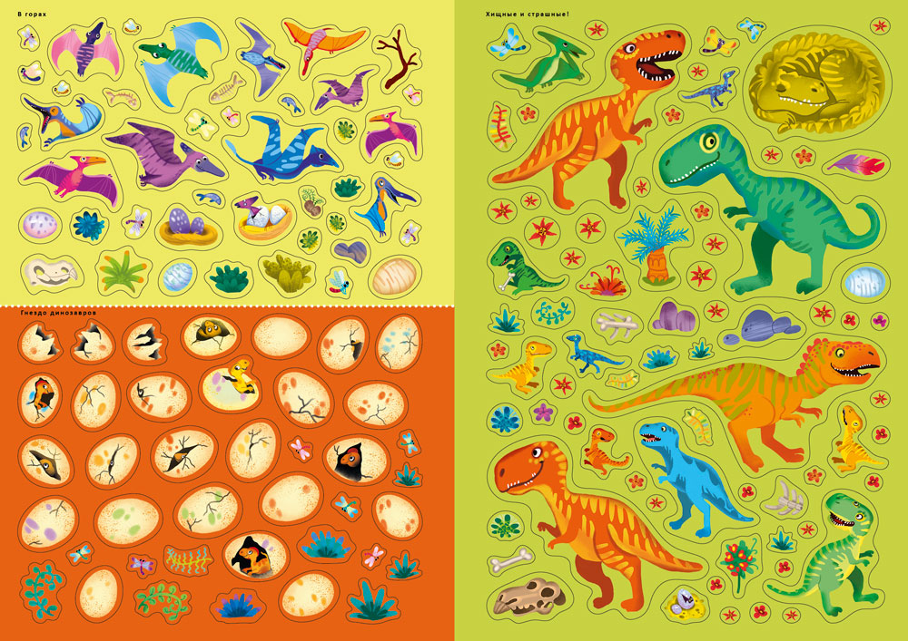 Более 600 ярких наклеек с изображениями различных динозавров, а также красочные страницы с фонами для заполнения.