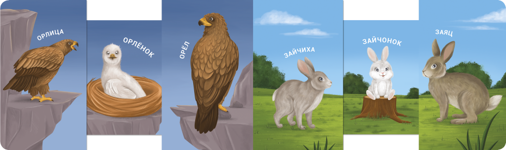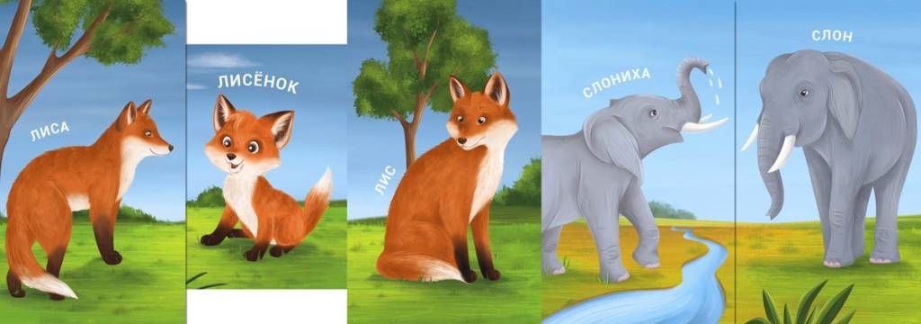 Рассматривайте красочные иллюстрации диких животных, запоминайте названия мамы и папы, раздвигайте страницу и узнавайте, как правильно назвать малыша.