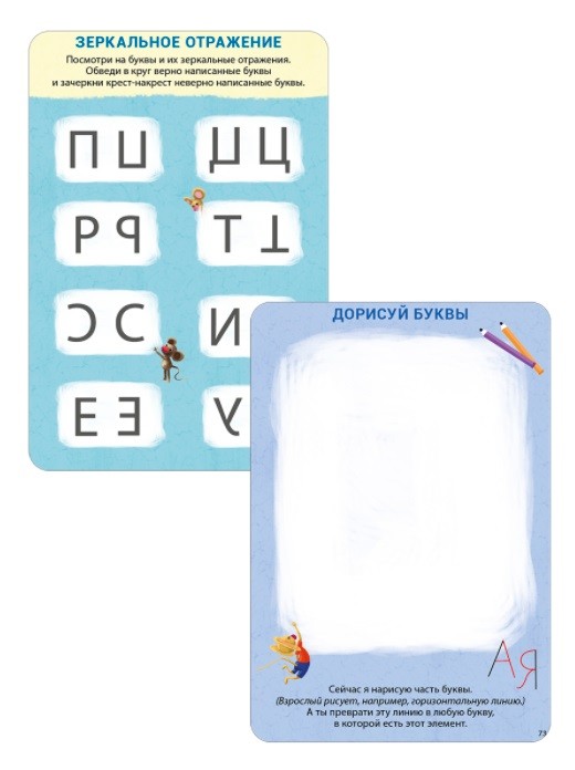 - На узнавание букв (перевернутых в пространстве, зашумленных (спрятанных под штриховку), правильно/неправильно написанных) и элементов, из которых они состоят.