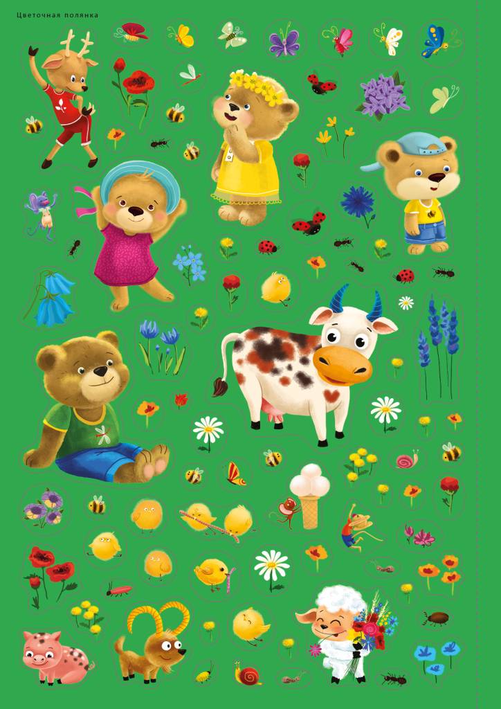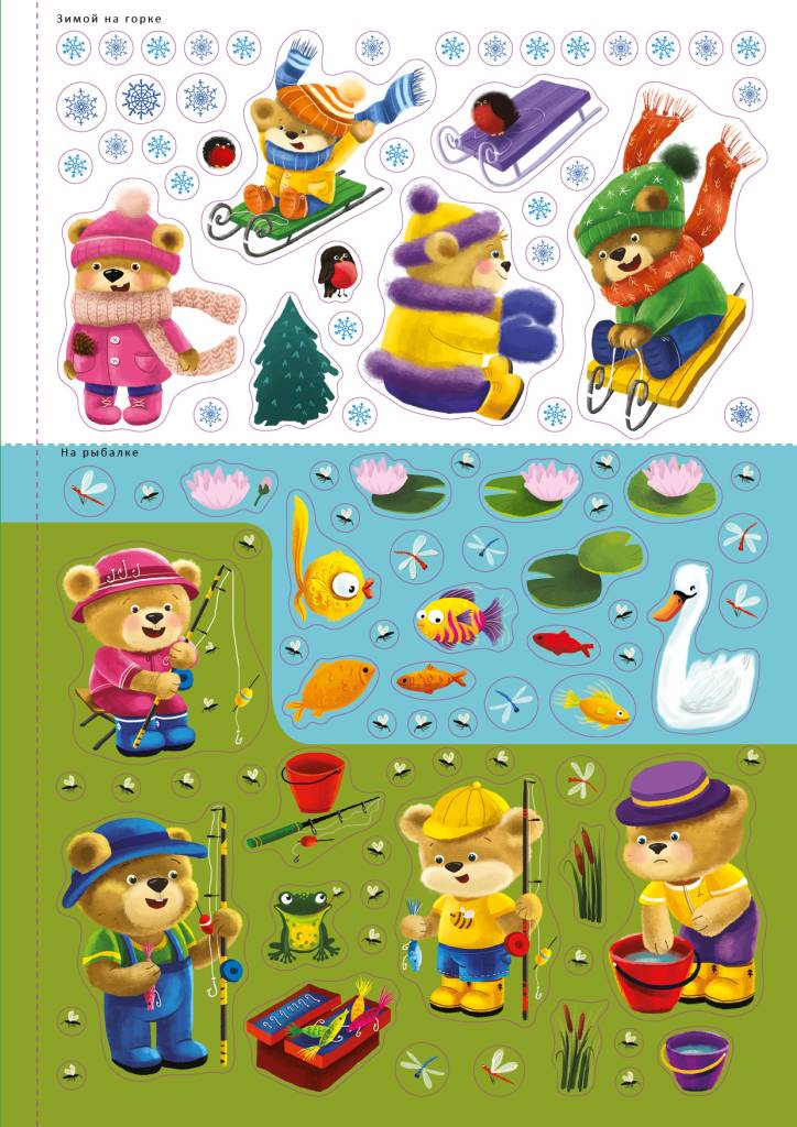 Более 600 ярких наклеек, которые помогут ребёнку создавать собственные картины и познакомят с весёлыми мишками ДружиМишками, красочные страницы с фонами для заполнения.