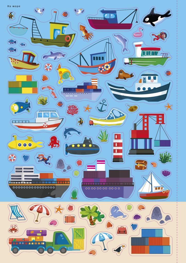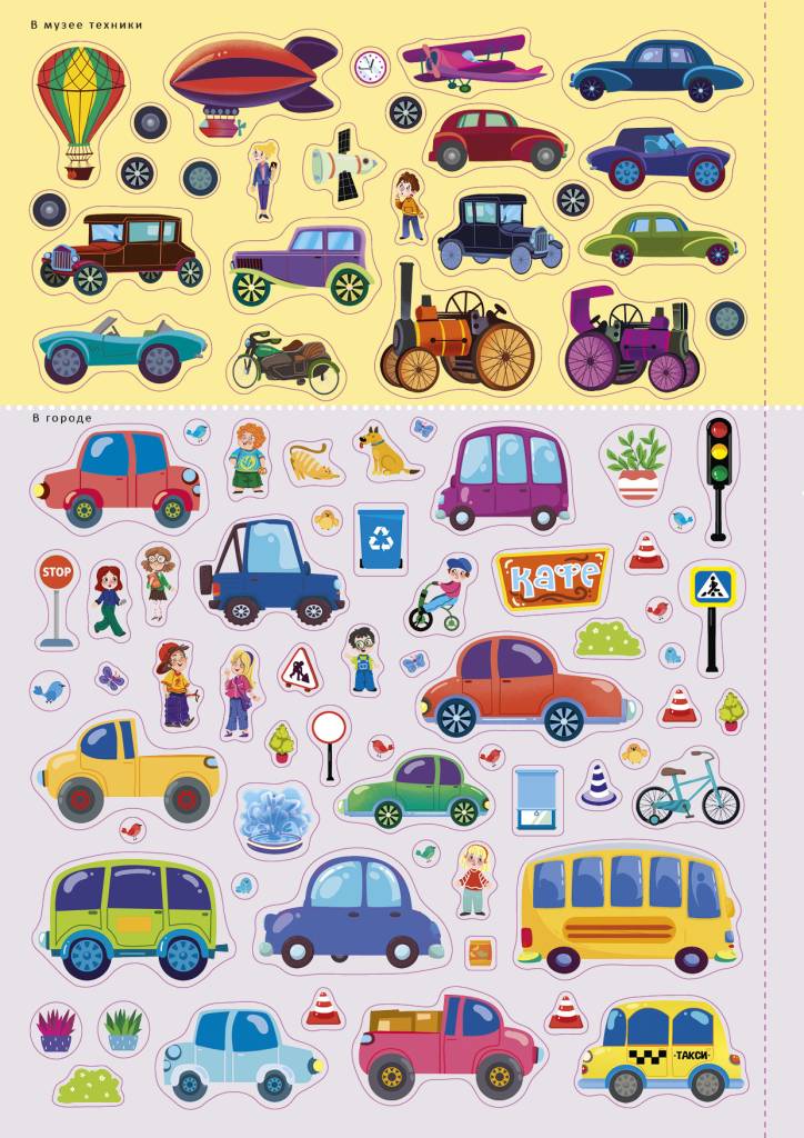 Более 600 ярких наклеек, которые помогут ребёнку создавать собственные картины и познакомят ребёнка с разными видами транспорта и другой техники.