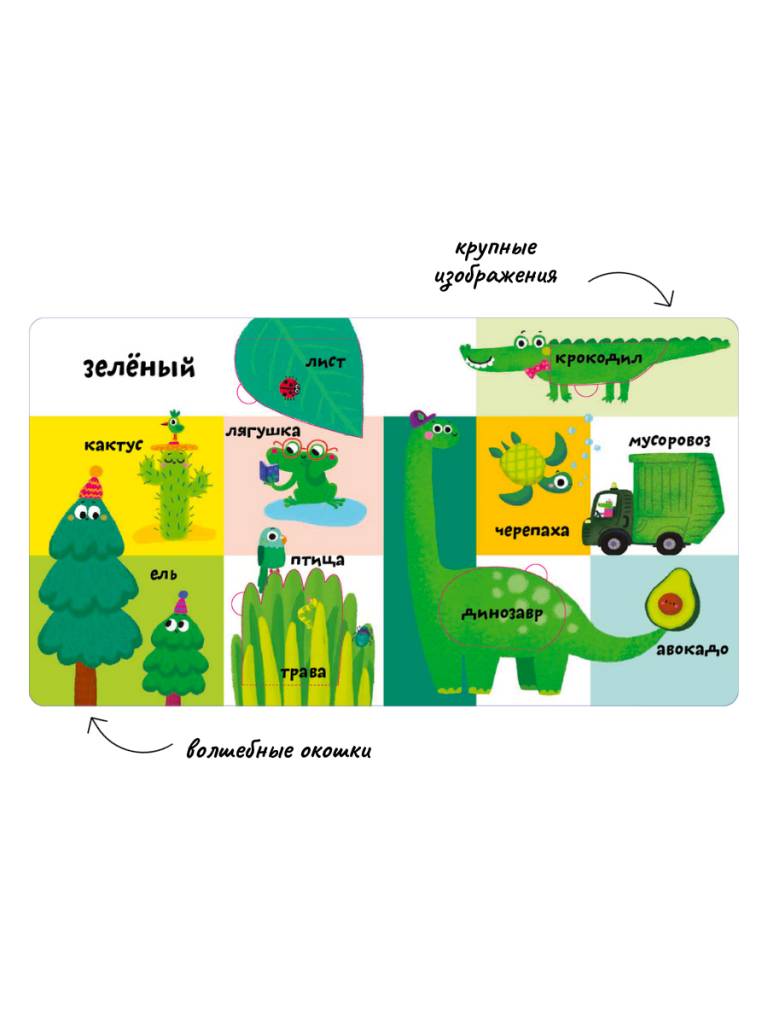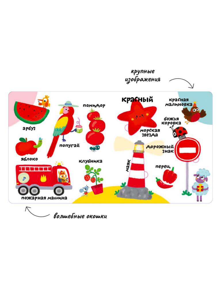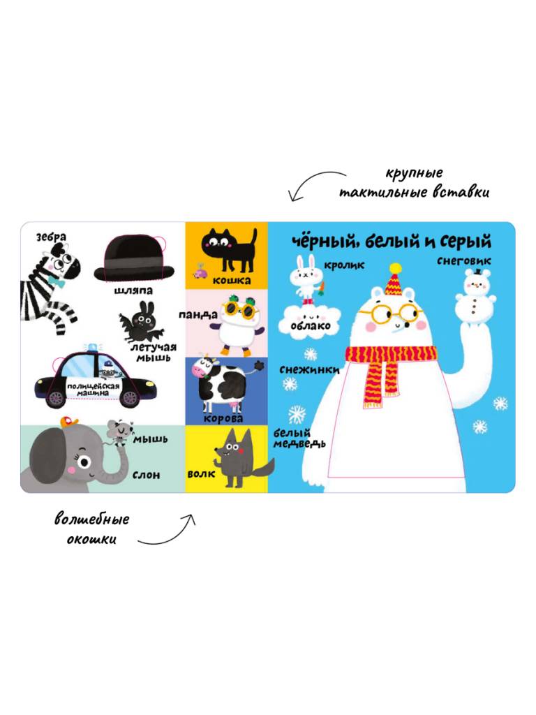 - Яркие иллюстрации, тактильные вставки и большие окошки.