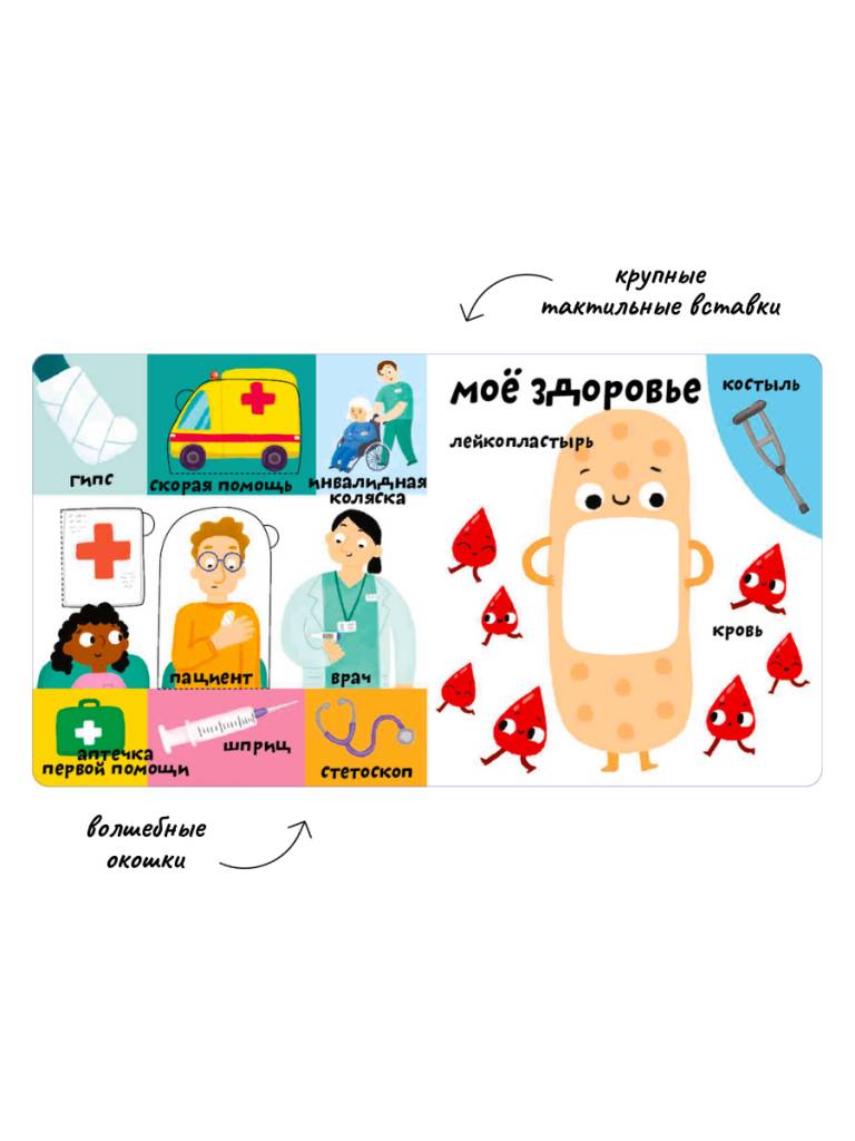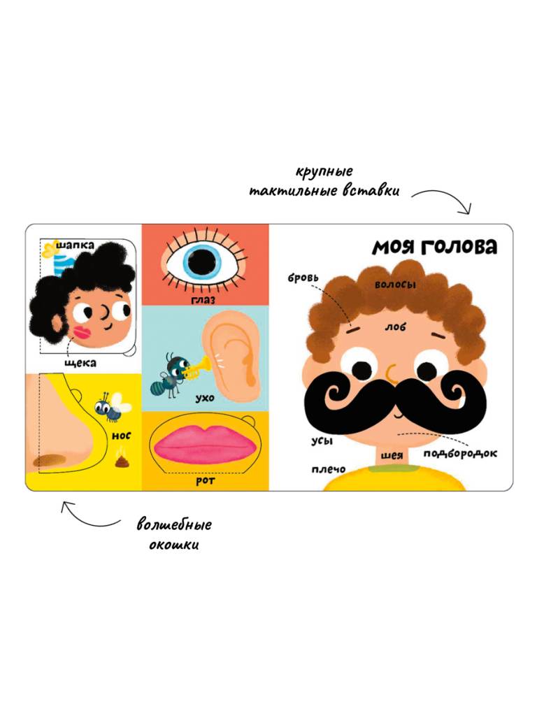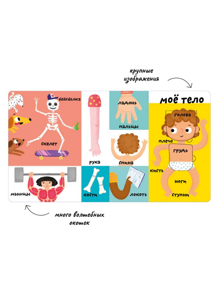 Необычная книжка для любознательных детей. Она познакомит малыша с его телом. Ребёнок узнает, как называются части тела, куда деваются съеденная еда и выпитая вода, почему мы видим и слышим, как двигаемся и дышим, какие чувства и эмоции испытываем, как нам быть здоровыми. Он узнает более 100 слов.Благодаря ярким иллюстрациям, тактильным вставкам и большим окошкам ребёнок с лёгкостью пополнит свой словарный запас, изучит много нового и познавательного.