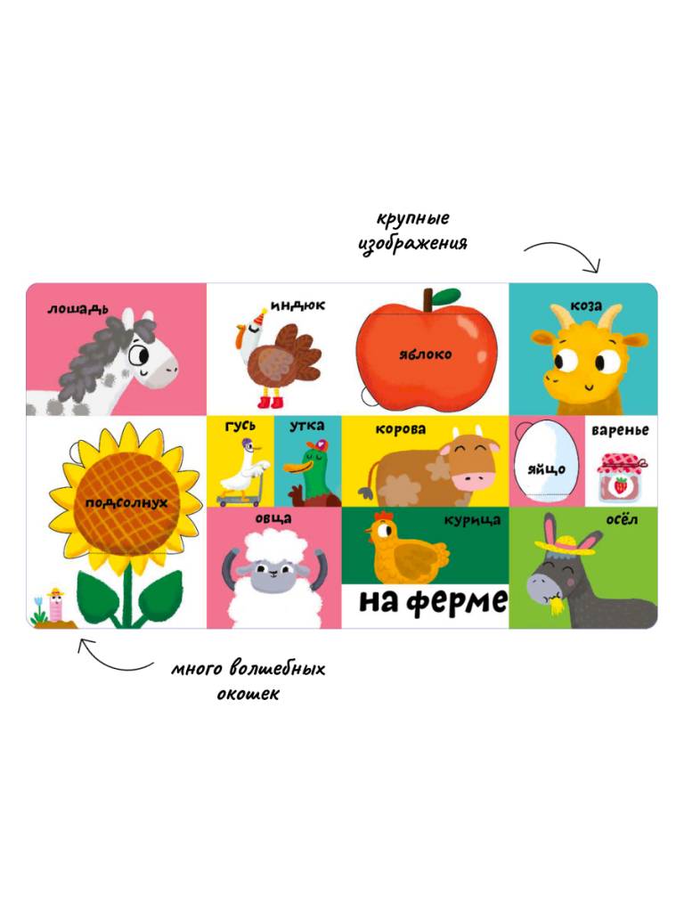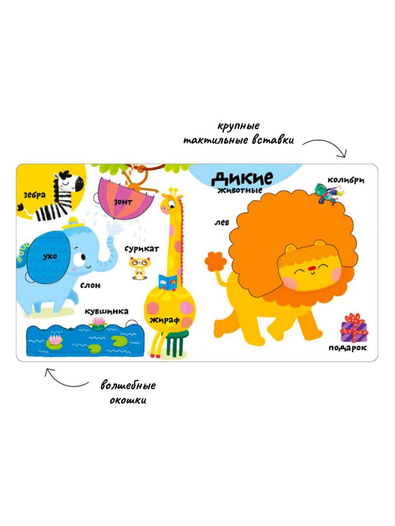 Благодаря ярким иллюстрациям, тактильным вставкам и большим окошкам ребёнок с лёгкостью пополнит свой словарный запас, изучит много нового и познавательного.
