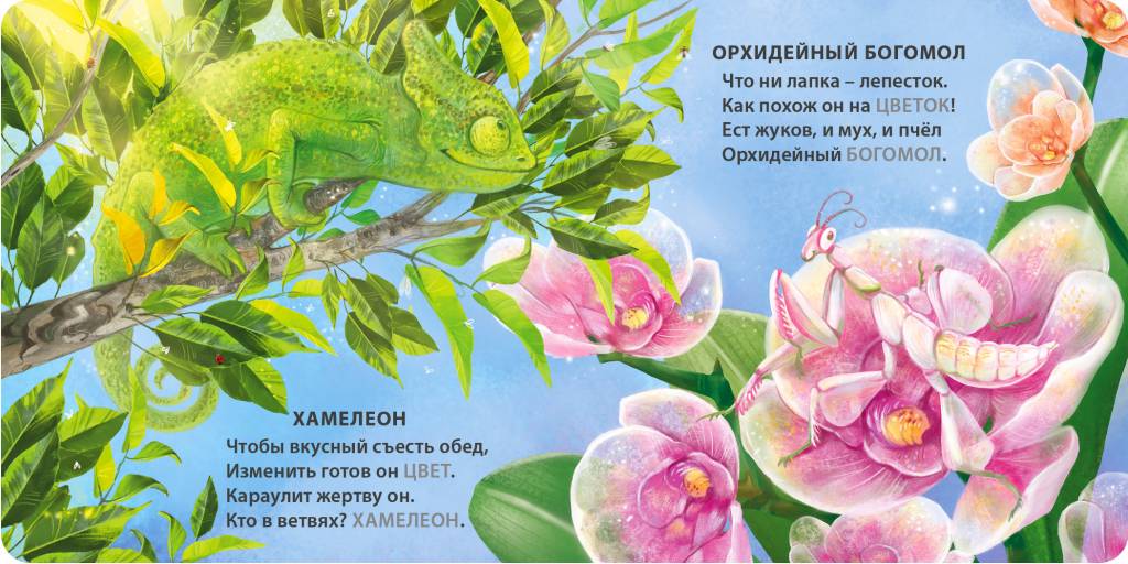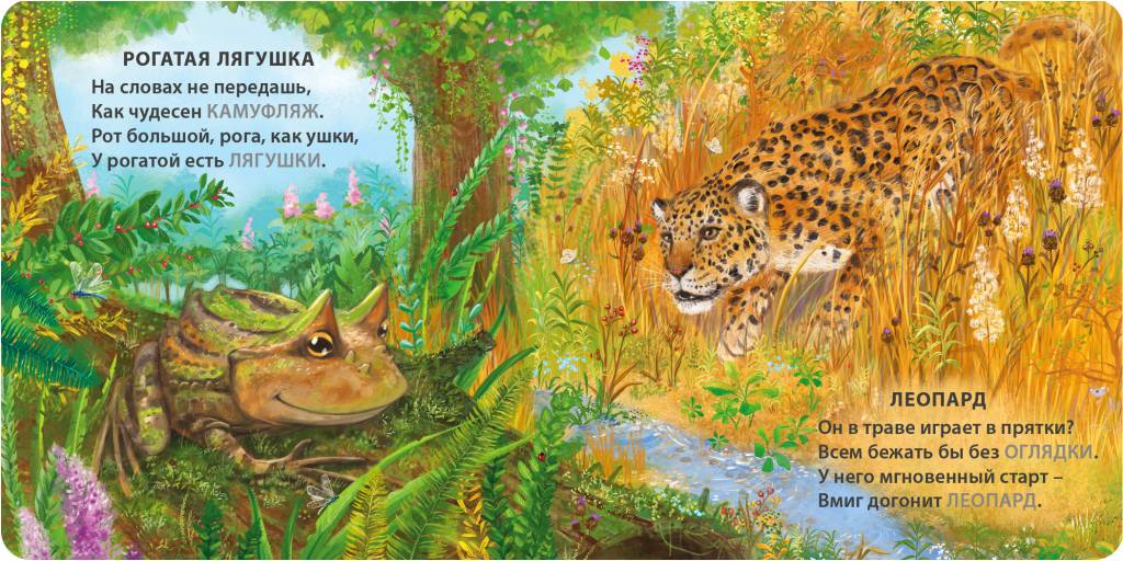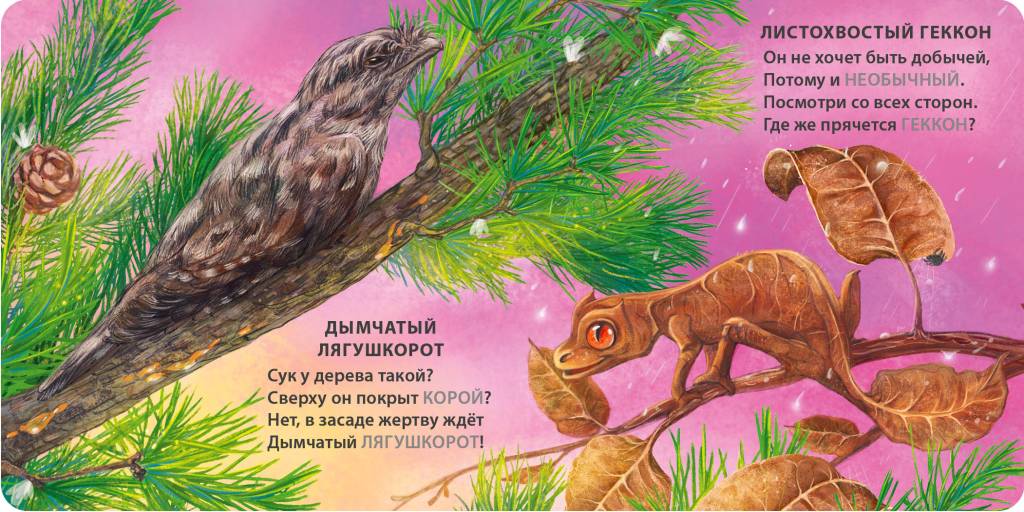 Книжка-картонка «ЖИВОТНЫЕ-НЕВИДИМКИ. Загадки-рифмы» в стихах Евгения Сосновского познакомит малыша с разными животными и тем, как они маскируются в природе. Стихи написаны так, чтобы ребёнок смог сам срифмовать название животного или другие слова.