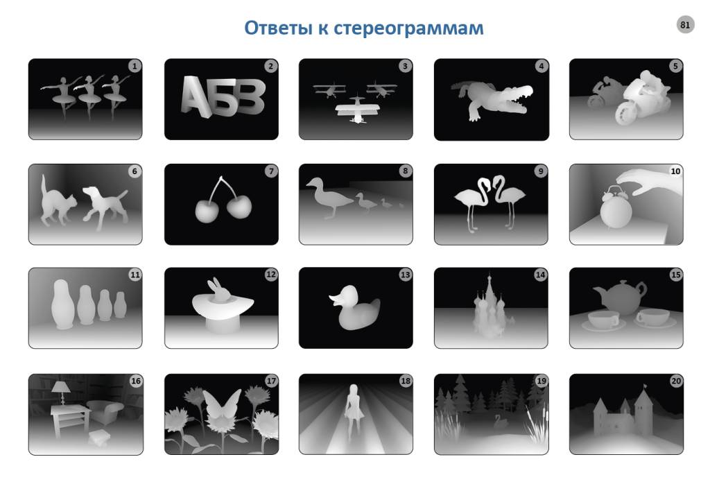 Более 80 разнообразных стереокартинок (стереограмм), ответы к ним, полихроматические картинки и оптические иллюзии, различные задания для тренировки зрения и картинки для профилактики «ленивого глаза», а также гимнастику для глаз.