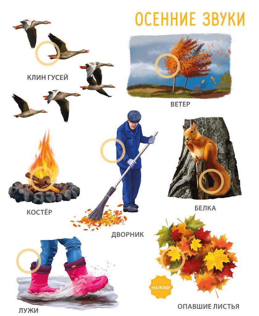 - 50 звуков предметов и явлений, животных и птиц.