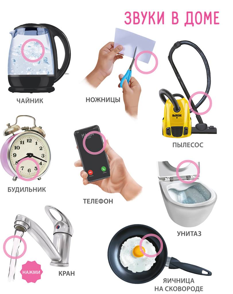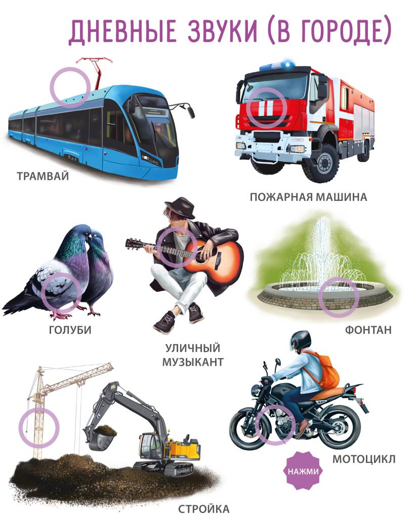 Ребёнок не только изучит, как они выглядят, но и услышит их звучание. Благодаря комплексному аудиовизуальному восприятию информации ваш малыш быстро и легко запомнит различные предметы и явления.