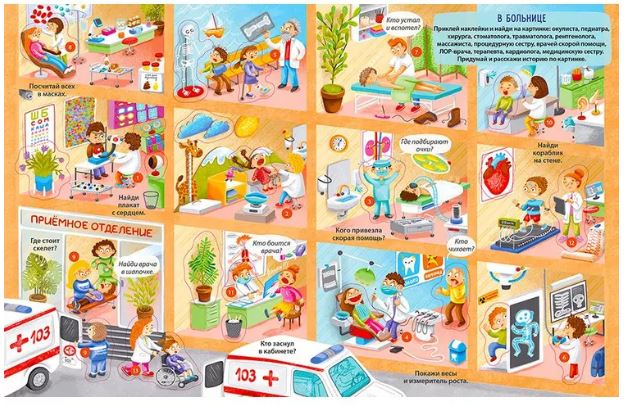 - 13 фонов с более 150 самых важных, нужных и популярных профессиями: в городе и на ферме, на стройке и в порту, в детском саду и в больнице, в торговом центре и в аэропорту и т.д.;