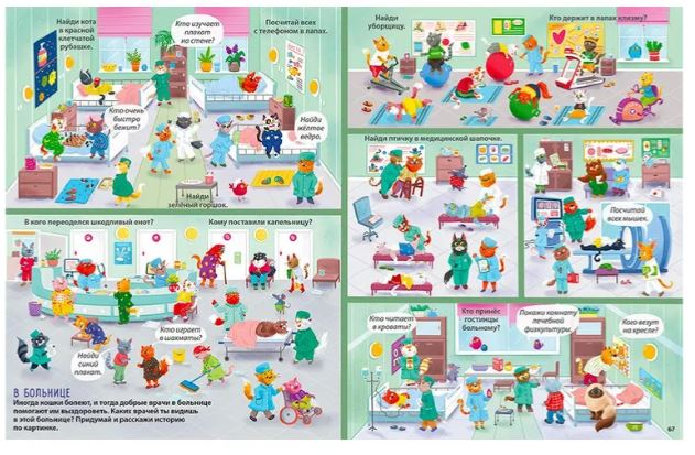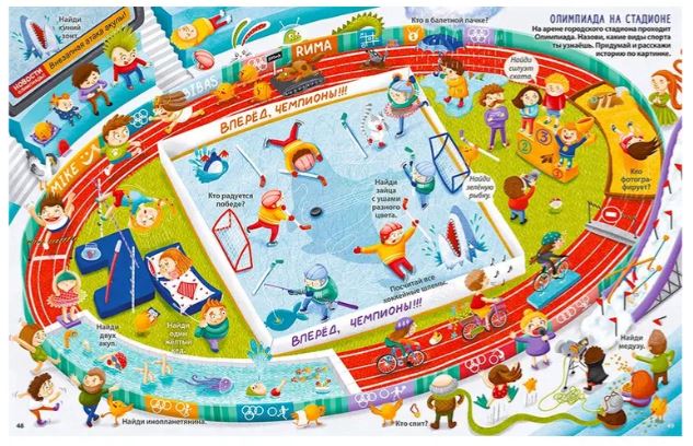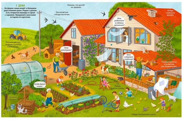 Начинать разглядывать картинки виммельбуха можно уже с года. А с трёх лет ребёнку будет интересно с ним играть и выполнять задания.