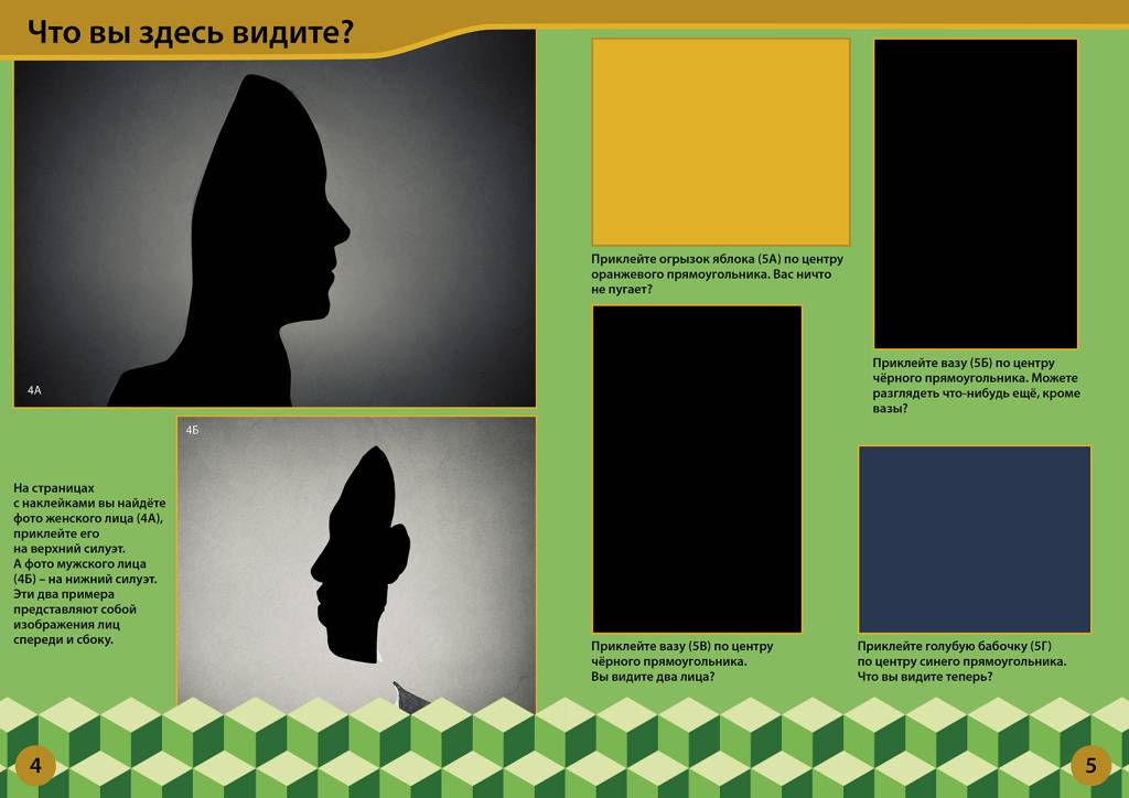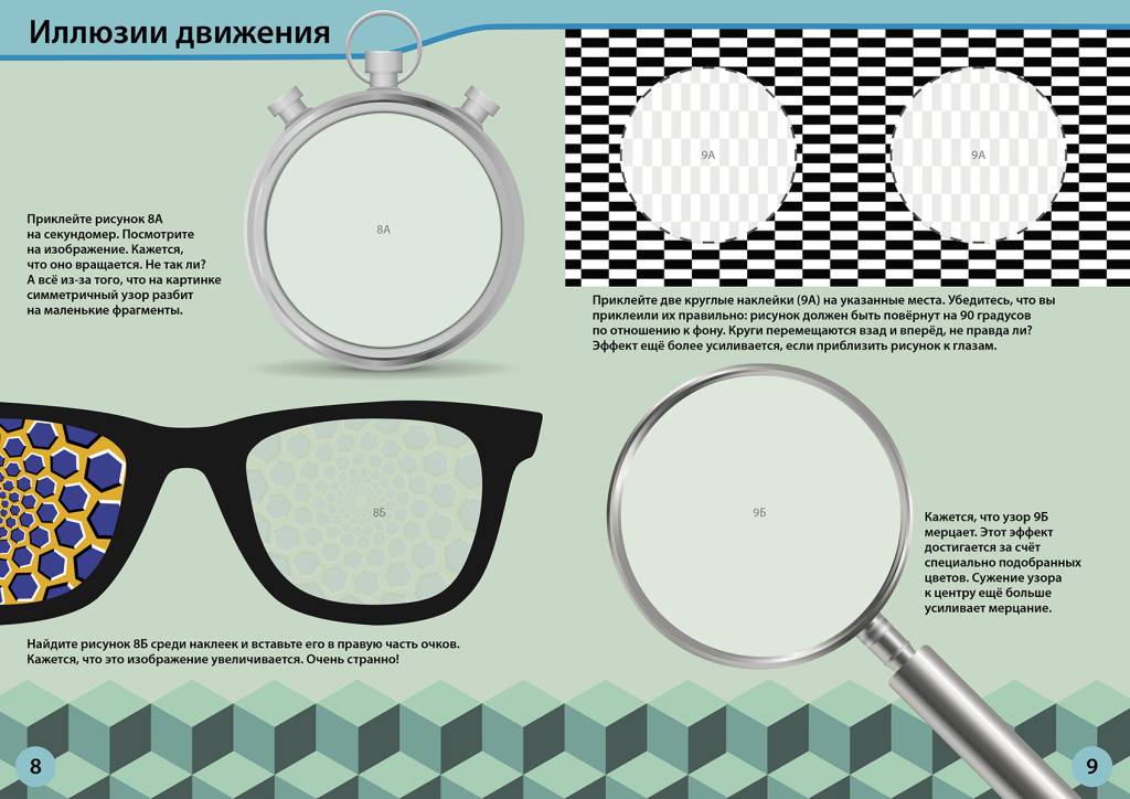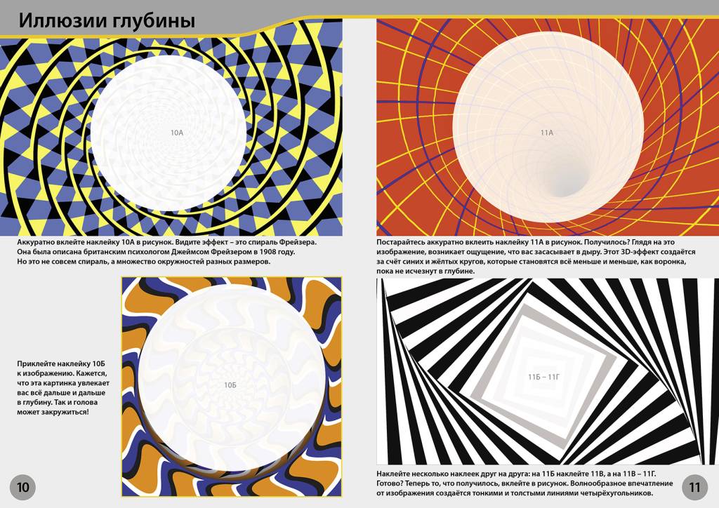 Под каждой картинкой-иллюзией указано, какая наклейка к ней подходит и как её наклеить. Откройте для себя мир оптических иллюзий и узнайте, как они работают.