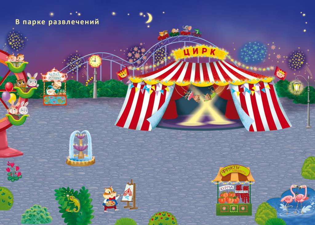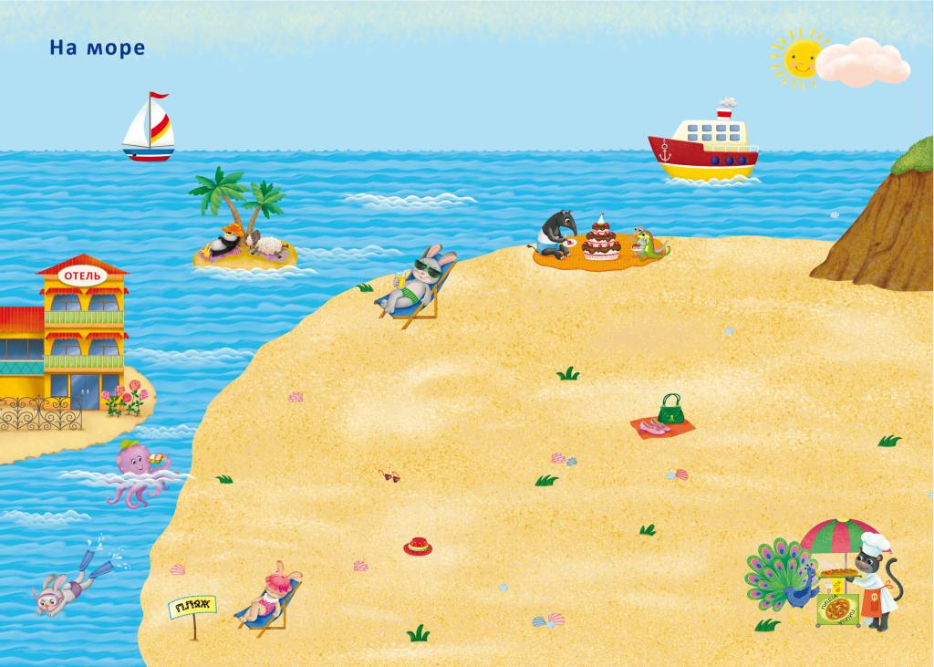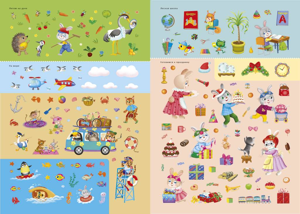 В ней вы найдёте 11 ярких тематических фонов о жизни и приключениях весёлых зверят на природе и в парке развлечений, в доме и на даче, на море и в лесной школе и т. д., более 600 красочных наклеек, которые помогут ребёнку создавать собственные картины и познакомят с весёлыми зверятами.