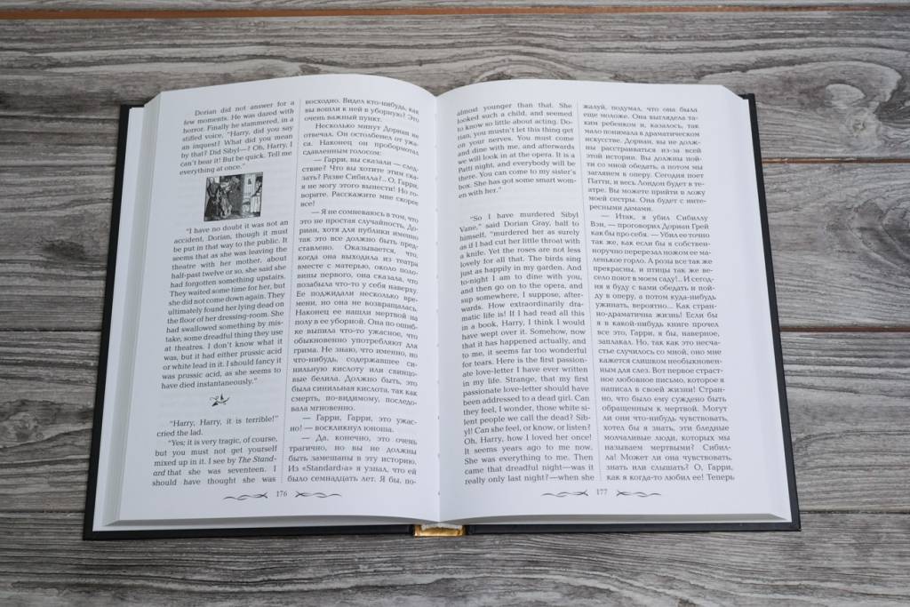 В данном издании дается текст оригинала с параллельным переводом Михаила Ликиардопуло, журналиста, разведчика и полиглота, а также тонкого ценителя творчества Оскара Уайльда. Его перевод «Портрета Дориана Грея» прекрасно передает язык оригинала и по праву считается одним из лучших. Текст сопровождается гравюрами Луи Трюго и Фернана Симеона. Фронтиспис — гравюра Генри Кина.