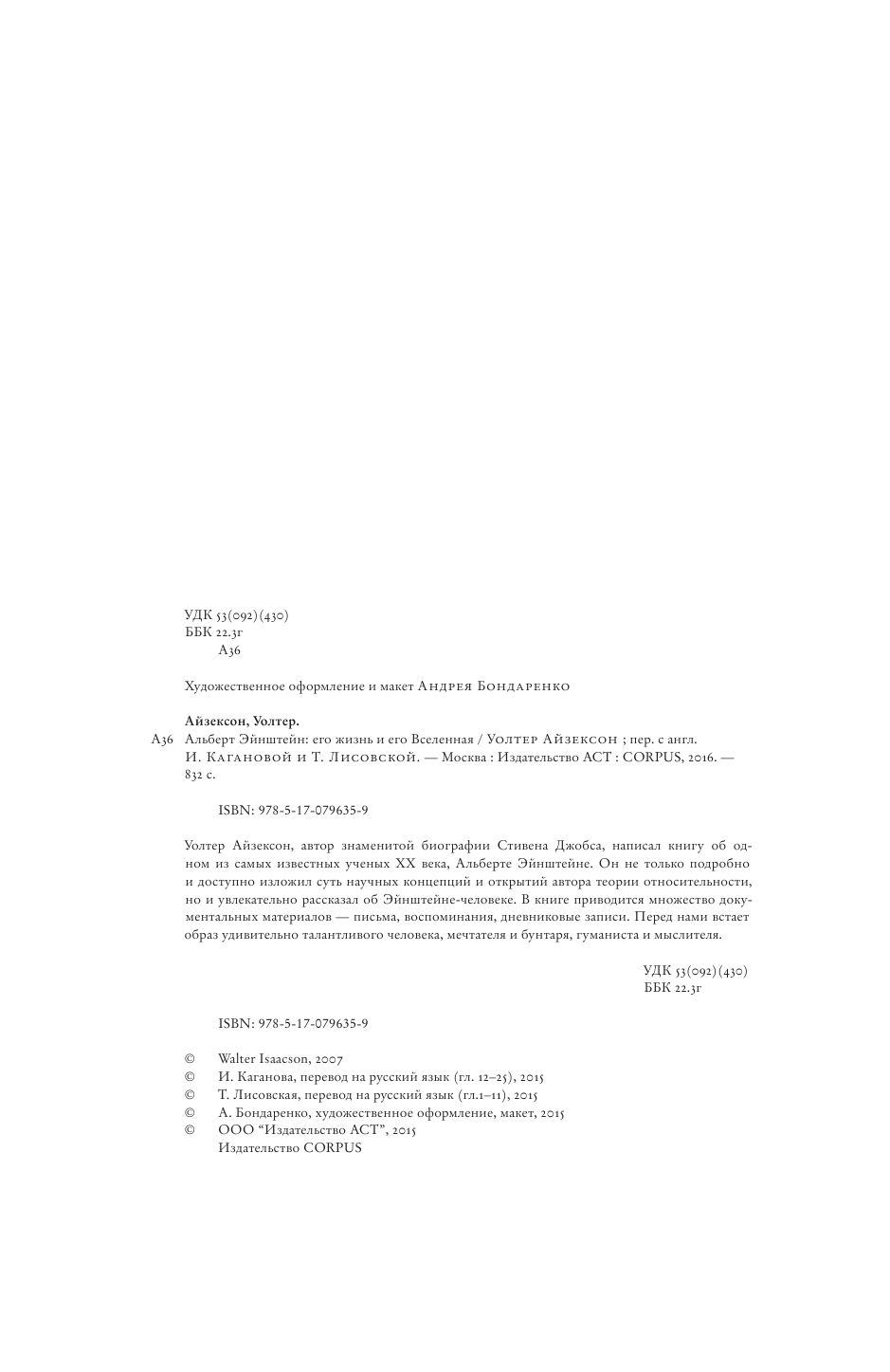 Цитата "Потрясающее удовольствие... Это — теплый, глубокий, нежный портрет, показывающий Эйнштейна человечным и необычайно очаровательным по своей сути... Удивительно законченный образ вечно поражающей личности Эйнштейна". Джэнет Маслин, Нью-Йорк Таймс "Этой книгой будут восторгаться повсеместно. Ее потрясающе легко читать, в ней изящно сочетаются личные и научные аспекты жизни Эйнштейна". Геральд Холтон, профессор физики Уолтер Айзексон не только подробно и доступно изложил суть научных концепций и открытий автора теории относительности, но и увлекательно рассказал об Эйнштейне-человеке. В книге приводится множество документальных материалов — письма, воспоминания, дневниковые записи. Перед нами встает образ удивительно талантливого человека, мечтателя и бунтаря, гуманиста и мыслителя.Характеристики