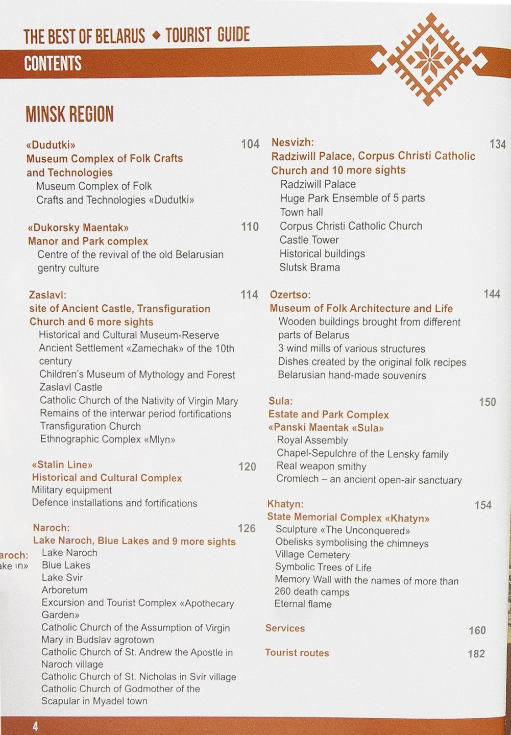-Туристический путеводитель "Лучшее в Беларуси" состоит из двух частей.Первая - информационная, здесь собраны статьи о наиболее интересных туристических местах. Для удобства эта часть представлена шестью блоками, каждый из которых посвящен областям Беларуси - Брестской, Витебской, Гомельской, Гродненской, Минской и Могилевской. Седьмой блок рассказывает о городе Минске и его достопримечательностях и туристических объектах.