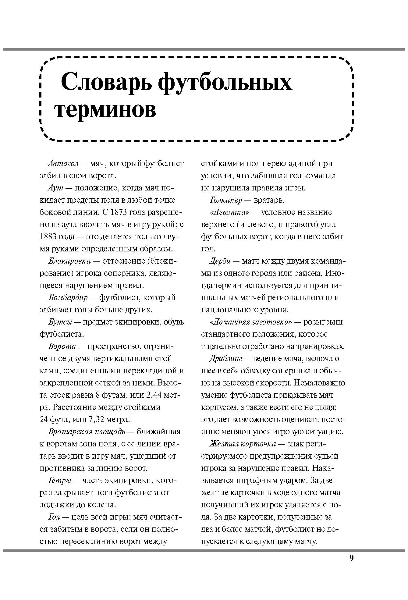 На страницах настоящей книги содержится много интересной и полезной информации: здесь изложены правила игры и «футбольная» терминология, даны советы по выбору мяча и подбору спортивной формы, а также по правильной организации тренировок и, конечно же, описаны основные приемы и техника владения мячом в защите, нападении и во вратарской площадке. Кроме того, в издании представлены примеры финтов, демонстрируемых звездами этого вида спорта.Характеристики