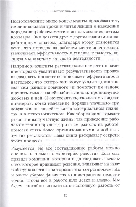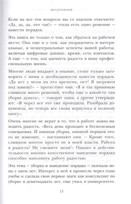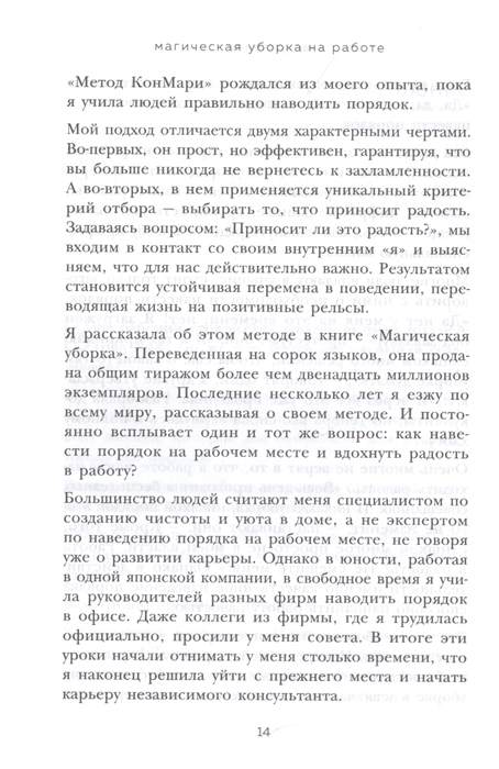 Первая книга Мари Кондо стала мировым бестселлером и помогла миллионам людей по всему миру разобрать завалы ненужного хлама и полюбить свои дома. Теперь она предлагает навести порядок на рабочем месте, где бы вы ни трудились: в офисе, дома или в мастерской. Ведь когда нам комфортно, светло и уютно, мы больше успеваем и меньше устаем.Кипы документов на рабочем столе, бесполезные чаты и созвоны, бесконечные электронные письма и срочные задачи опустошают и лишают мотивации, ограничивают продуктивность и возможности карьерного роста.