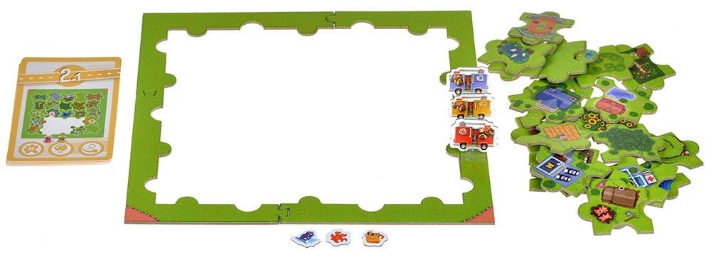 Перед началом игры соедините 4 рамки – это границы игрового поля. Затем выберите любую карту головоломки и выложите стартовый пазл, как на ней указано, чтобы составить текущий план города. У вас останется несколько деталей пазла – с их помощью вы и будете решать задачу. На карте головоломки также указано, где на поле располагаются жетоны происшествий и фишка пожарной машины. Расположите их согласно карте. Теперь вы готовы помогать пожарным!