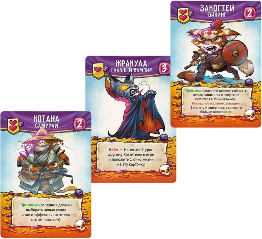 В начале хода вы укрепляете свою команду когтителей, выкладывая новых помощников из руки. Каждого такого союзника нужно обеспечить запасом здоровья, отмечая его специальными жетонами-сердечками. Вместо пополнения команды можно взять дополнительные карты из основной колоды – выбор зависит от текущей ситуации и вашей стратегии.