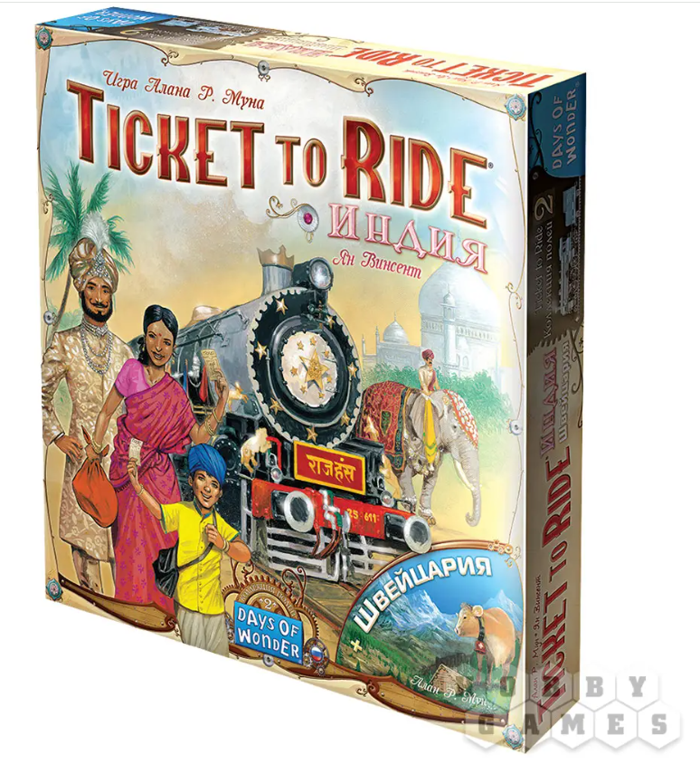 В состав "Ticket to Ride: Индия и Швейцария" входит новое двухстороннее игровое поле. Как можно понять из названия, одна из сторон поля представляет собой карту Индии, а другая – карту Швейцарии. В Индии вас ожидают партии с высоким уровнем конкуренции за перегоны между городами, а также за паромы – особые перегоны, соединяющие города по воде. Будьте хитрее остальных игроков, чтобы достичь своей цели и постарайтесь организовать "Великие туры" по Индии!