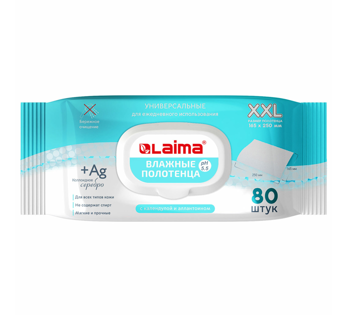 Самсон Полотенца влажные 80 шт., БОЛЬШИЕ XXL 16,5х25см, с аллантоином и коллоидным серебром, LAIMA,