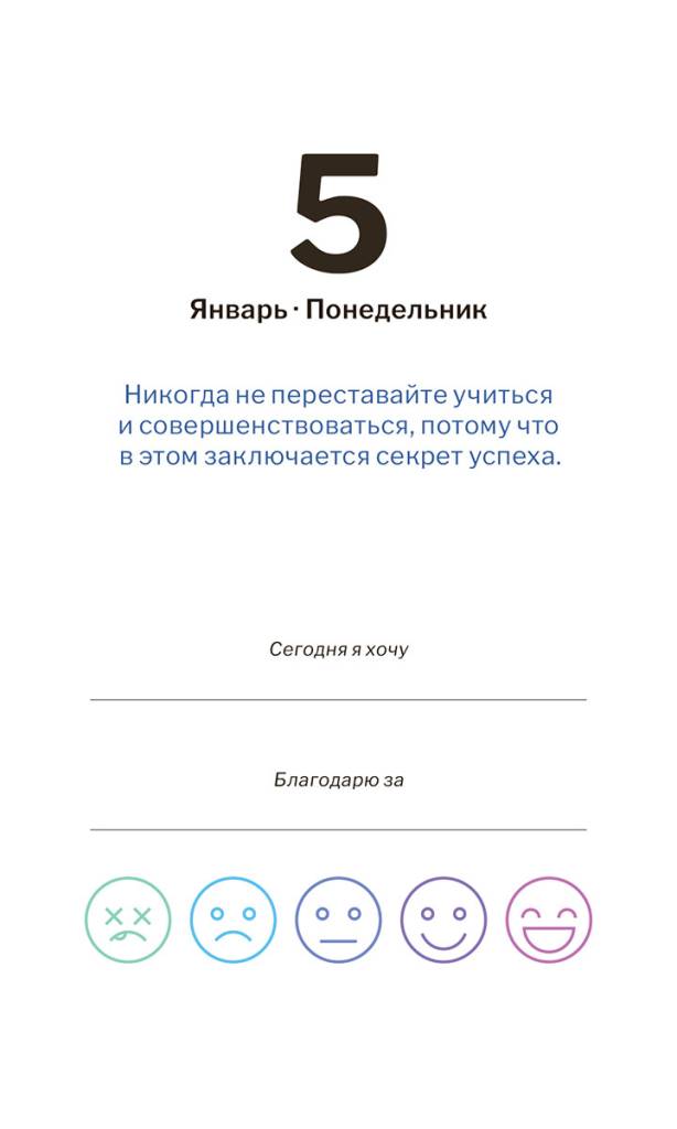 На каждой странице — короткие фразы, которые вдохновят и зарядят позитивом. Записывайте свои цели, мечты и желания, а также фиксируйте, за что вы благодарны этому дню прямо на страницах календаря в специальных полях. Отмечайте эмоции в трекере настроения и наблюдайте, как растёт ваш внутренний ресурс.