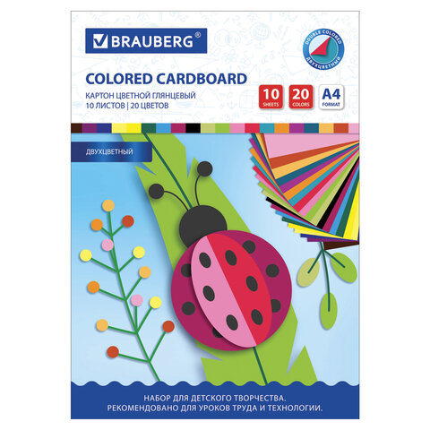 Картон цветной А4 2-цветный МЕЛОВАННЫЙ, 10л. 20 цветов, в папке, BRAUBERG, 200х290мм, 113553