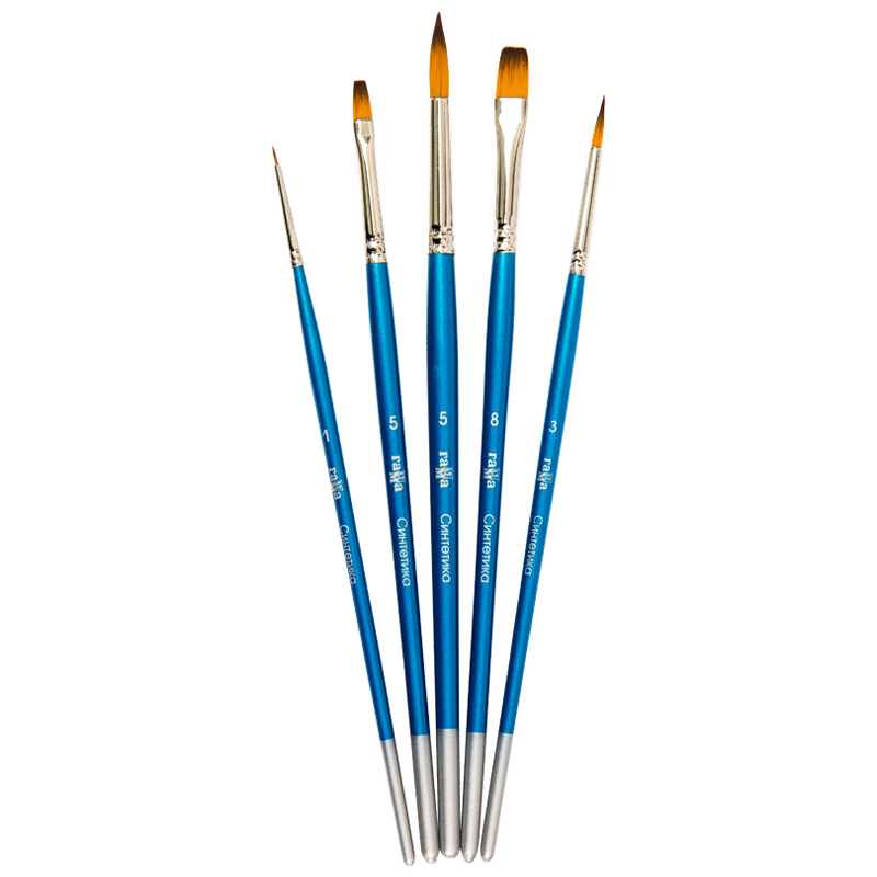 Набор кистей из синтетики: круглые №1, 3, 5, плоские № 5, 8. Кисти из синтетики — аналог натурального колонка по параметрам жесткости и эластичности. Производятся из японского полиэфирного волокна высшего качества: универсальны, долговечны, подходят для любого типа красок.Деревянная ручка с многослойным лакокрасочным покрытием.