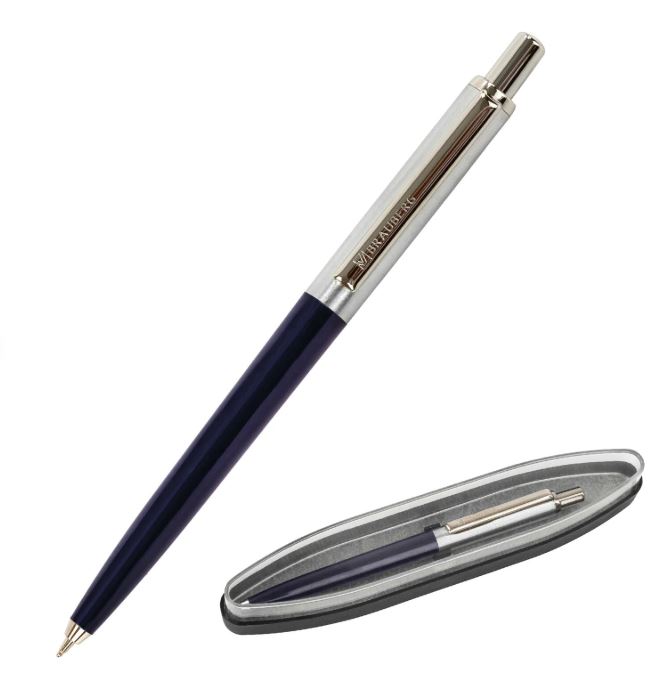 ----...-Самсон Ручка подарочная шариковая BRAUBERG, СИНЯЯ, корпус серебристый с черным, 0,5мм, 143484