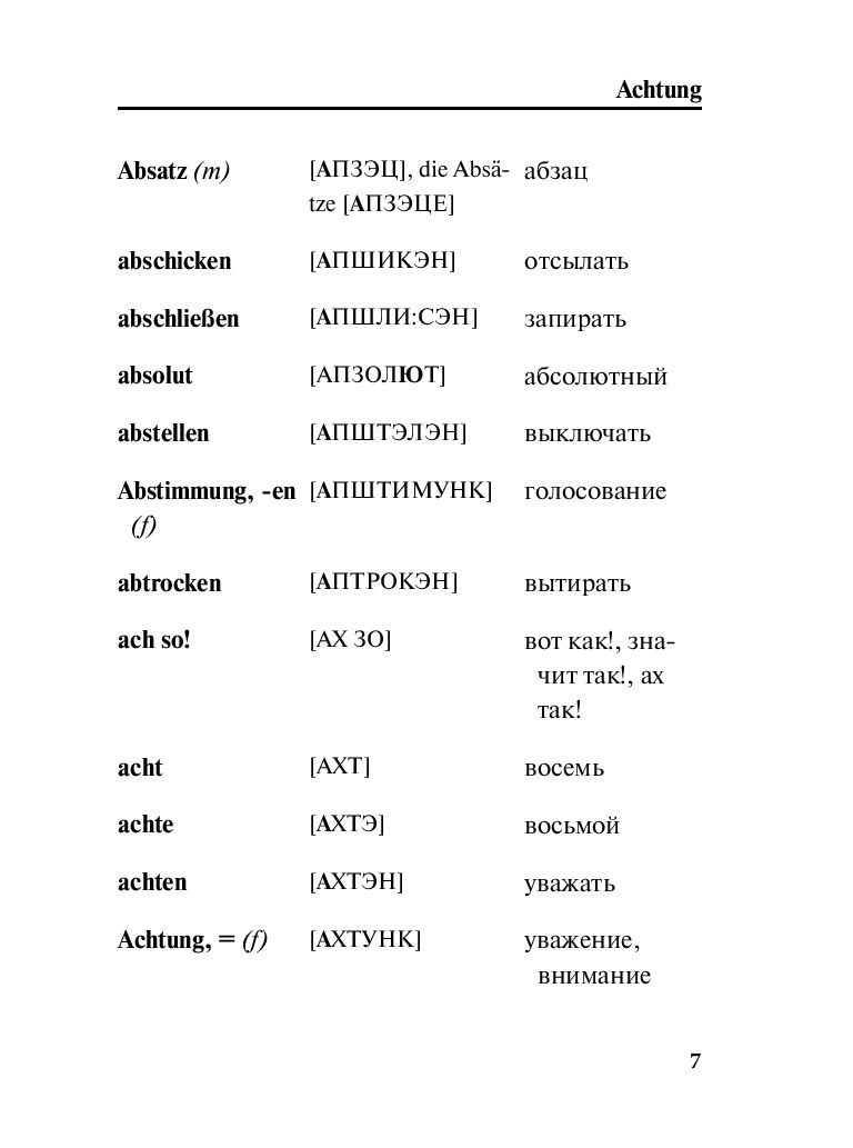 Известный автор С. А. Матвеев предлагает немецко-русский и русско-немецкий словарь для начинающих. В каждой части содержится по 4000 самых употребительных слов. Все слова снабжены транскрипцией русскими буквами, причем в русско-немецкой части тоже дается транскрипция немецких слов. Сложные формы множественного числа существительных представлены полностью. Словарь предназначен для всех, кто стремится овладеть немецким языком.Характеристики