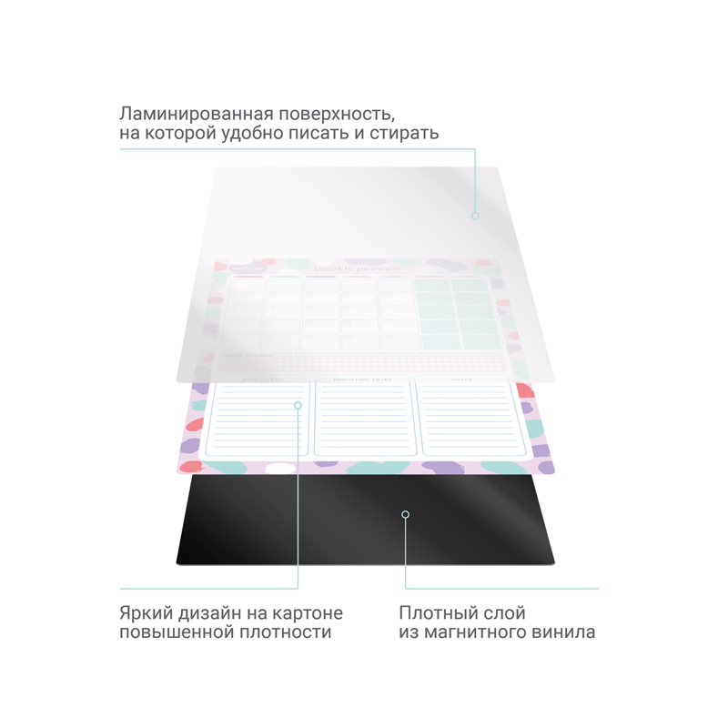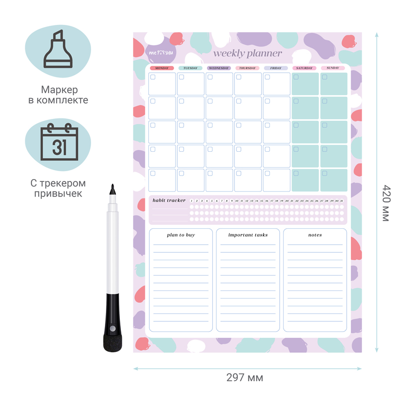 Магнитный планер на месяц MESHU Bright color – отличный помощник в планировании времени. Планер формата А3 выполнен из картона плотностью 200 г/м2, покрытого магнитным винилом. Ламинация позволяет многократно писать и стирать надписи. Размер магнитного расписания – 297*420 мм. В комплекте прилагается маркер на магните со стирателем, которым очень удобно корректировать записи и крепить его к любой металлической поверхности (например, к холодильнику). Внимание! Используйте только маркер на водной основе. Для очистки поверхности используйте влажную салфетку. Планер выполнен в универсальном оригинальном дизайне. Он поможет запомнить задачи, спланировать расписание и встречи с коллегами, друзьями или семьёй. Трекер привычек позволит вам добиться успехов в любых начинаниях: бегать по утрам, раньше вставать или ложиться спать и правильно питаться.Комплект упакован в индивидуальный пакет.