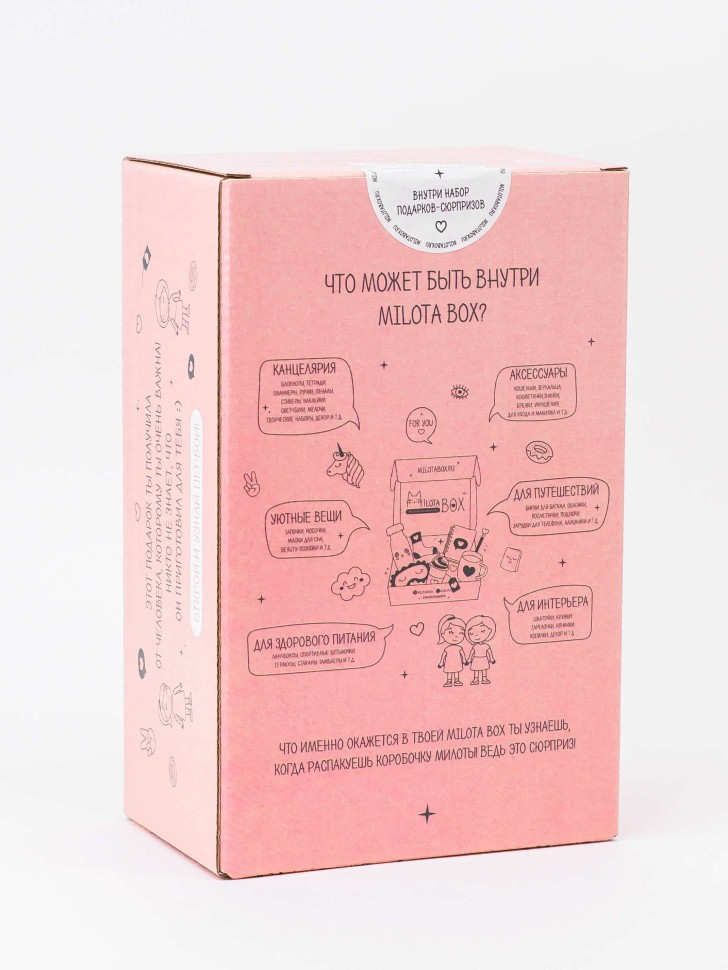 Каждая коробочка милоты наполнена необычными вещицами, которыми будет приятно пользоваться в повседневной жизни: милая канцелярия, уютные товары для дома, стильные аксессуары, предметы для здорового образа жизни и приятные мелочи. Внутри Milota BOX находится до 8 сюрпризов, упакованных в стилизованную подарочную бумагу тишью. Коробочка из плотного, дизайнерского картона. Размер коробочки: 22 х 14 х 9 см. Общий вес: 550 гр.Характеристики