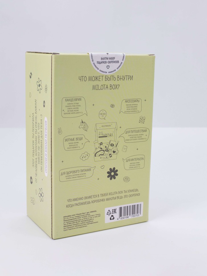 Каждая коробочка милоты наполнена необычными вещицами, которыми будет приятно пользоваться в повседневной жизни: милая канцелярия, уютные товары для дома, стильные аксессуары, предметы для здорового образа жизни и приятные мелочи. Внутри Milota BOX находится до 8 сюрпризов, упакованных в стилизованную подарочную бумагу тишью. Коробочка из плотного, дизайнерского картона. Размер коробочки: 22 х 14 х 9 см. Общий вес: 550 гр.
