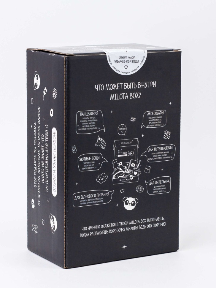 Каждая коробочка милоты наполнена необычными вещицами, которыми будет приятно пользоваться в повседневной жизни: милая канцелярия, уютные товары для дома, стильные аксессуары, предметы для здорового образа жизни и приятные мелочи. Внутри Milota BOX находится до 8 сюрпризов, упакованных в стилизованную подарочную бумагу тишью. Коробочка из плотного, дизайнерского картона. Размер коробочки: 22 х 14 х 9 см. Общий вес: 550 гр.