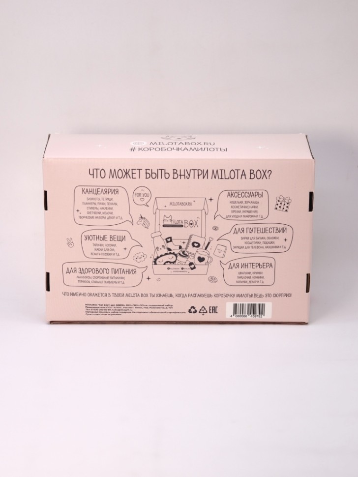 Каждая коробочка милоты наполнена необычными вещицами, которыми будет приятно пользоваться в повседневной жизни: милая канцелярия, уютные товары для дома, стильные аксессуары, предметы для здорового образа жизни и приятные мелочи. Наполнение MilotaBox стало ещё лучше! Больше подарков! Внутри каждого MilotaBox находится до 13 предметов на одну тематику, упакованных в стилизованную бумагу тишью. Коробочка из плотного, дизайнерского картона. Размер коробочки: 28,5 х 18,5 х 9,5 см. Общий вес: 900 гр.Характеристики